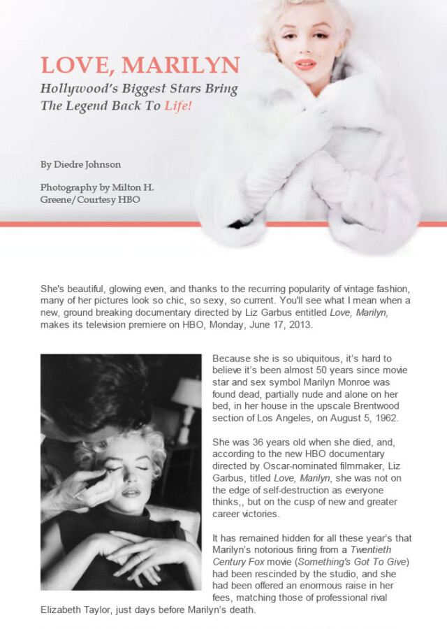 She’s beautiful, glowing even, and thanks to the recurring popularity of vintage fashion, many of her pictures look so chic, so sexy, so current. You’ll see what I mean when a new, groundbreaking documentary directed by Liz Garbus entitled Love, Marilyn, makes its television premiere on HBO, Monday, June 17, 2013.