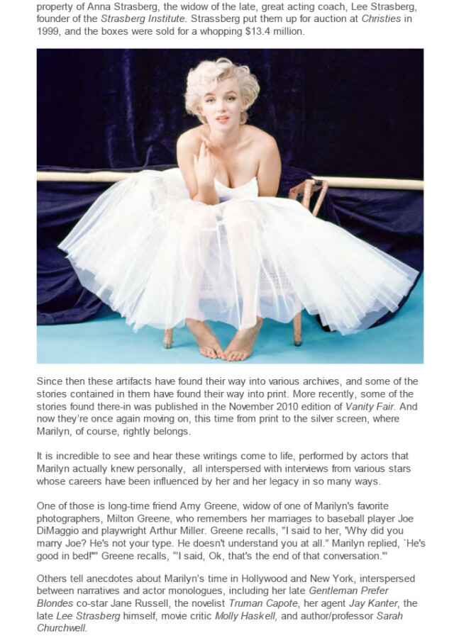 Since then these artifacts have found their way into various archives, and some of the stories contained in them have found their way into print. More recently, some of the stories found there-in was published in the November 2010 edition of Vanity Fair. And now they’re once again moving on, this time from print to the silver screen, where Marilyn, of course, rightly belongs.