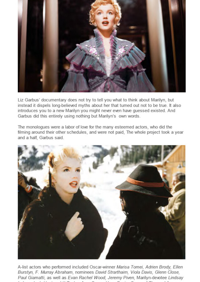 Garbus explained, “With a documentary, you have all this inner material and filmmakers attack it very different ways. We felt that these documents could be brought to life by actors and actresses. The people who signed on wanted to do the project and were long admirers of Marilyn. They taught me a lot about their feelings towards Marilyn. We were dealing with so many schedules but we made it work,” she concluded.