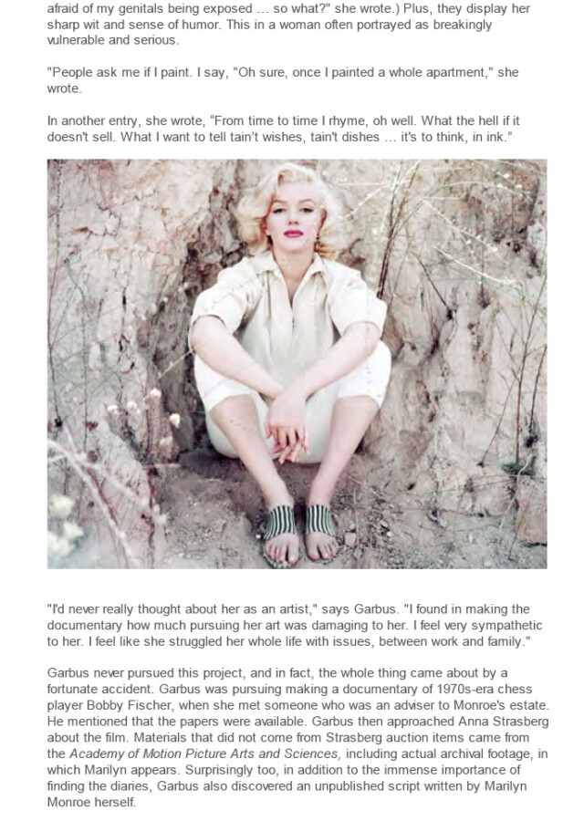 Garbus never pursued this project, and in fact, the whole thing came about by a fortunate accident. Garbus was pursuing making a documentary of 1970s-era chess player Bobby Fischer, when she met someone who was an adviser to Monroe’s estate. He mentioned that the papers were available. Garbus then approached Anna Strasberg about the film. Materials that did not come from Strasberg auction items came from the Academy of Motion Picture Arts and Sciences, including actual archival footage, in which Marilyn appears. Surprisingly too, in addition to the immense importance of finding the diaries, Garbus also discovered an unpublished script written by Marilyn Monroe herself.